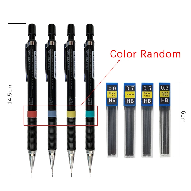 This mechanical pencil set includes pencils with lead sizes of 0.3mm, 0.5mm, 0.7mm, and 0.9mm, making it ideal for school, writing, and art drawing. Each pencil is approximately 14.5cm in length and is designed for comfortable use.