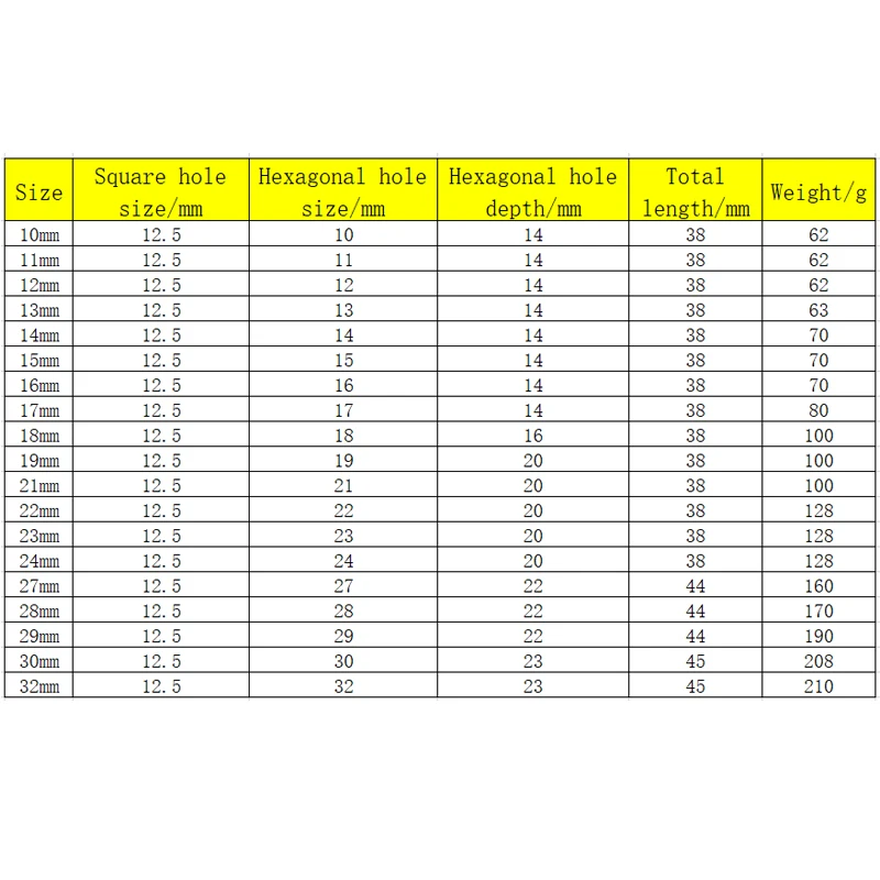 - Compatible with a range of socket sizes: 10mm, 12mm, 13mm, 14mm, 16mm, 17mm, 18mm, 19mm, 21mm, 24mm, 27mm, 30mm, 32mm.