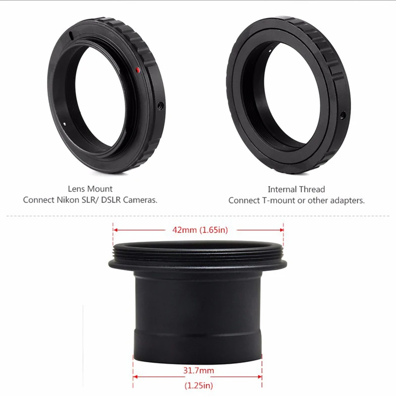 - Allows for direct mounting of SLR cameras onto a 1.25-inch eyepiece diameter telescope.