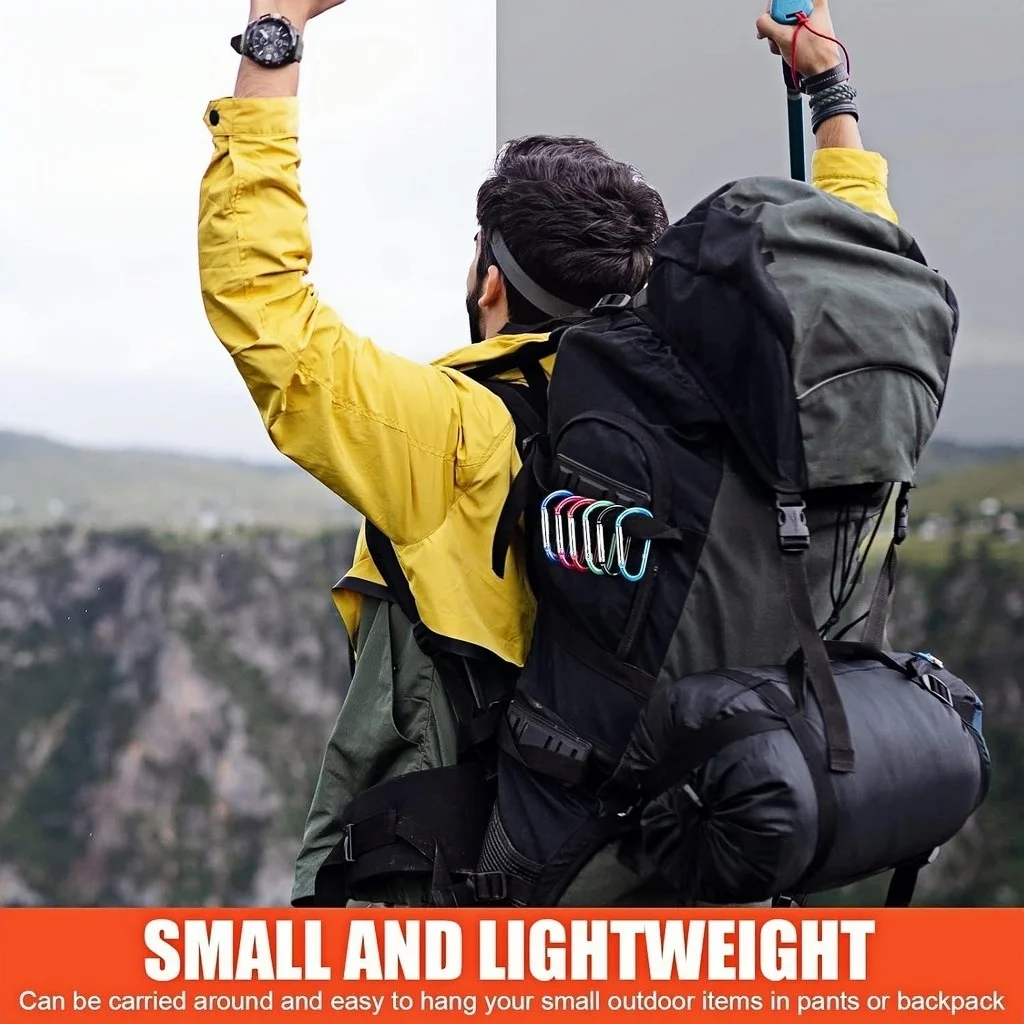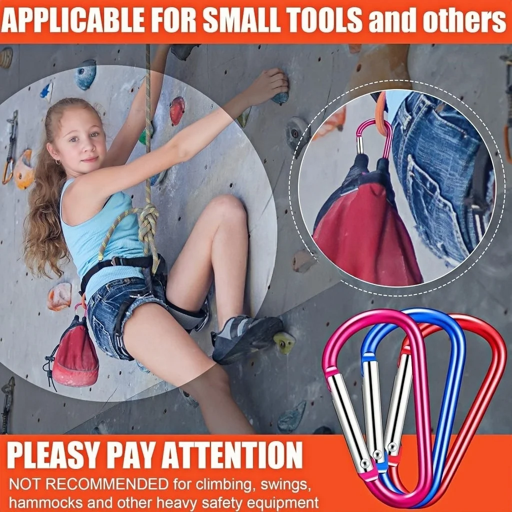 This product is a set of durable aluminum alloy carabiners, perfect for outdoor activities such as climbing, camping, and hiking. These spring snap clips are designed for versatility and ease of use, making them an essential tool for your adventures.