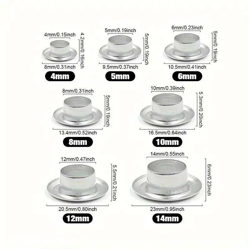 This set of stainless steel eyelets and grommets is perfect for various leather craft projects, including shoe repairs. With sizes ranging from M4 to M14, these durable metal eyelets come with washers for added support and stability.