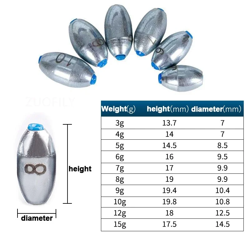 This product includes a set of 10 Alloy Hollow Olive Fishing Sinkers, available in various weights ranging from 3g to 15g. These fishing weights are designed to enhance your fishing experience by providing stability and reducing resistance in the water.