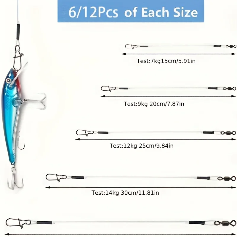 This product includes 12 pieces of fluorocarbon fishing leaders designed for both saltwater and freshwater fishing. They are equipped with high-speed 360° rotating swivels, making them ideal for catching various fish species such as pike and bass.