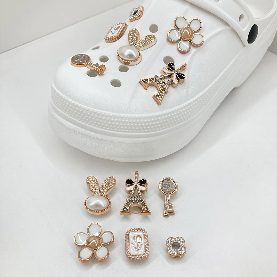 Enhance your footwear with this 14-piece set of sparkling golden faux pearl shoe charms. These detachable decorations are perfect for personalizing your CROCS or clogs, making them ideal for parties or as a thoughtful gift. Each charm adds a touch of elegance and fun to your shoes.