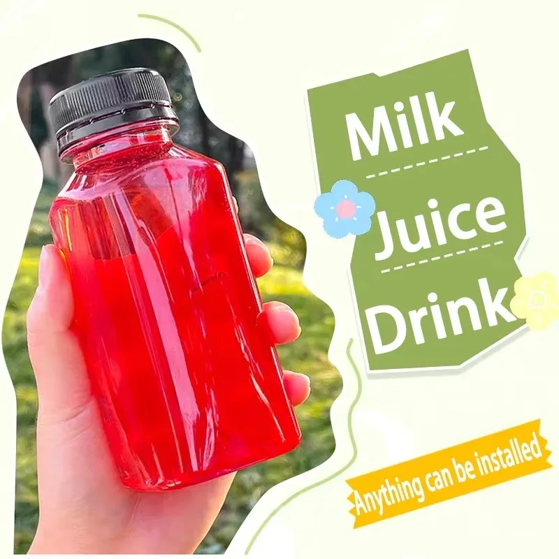 These empty plastic drink containers are perfect for storing a variety of liquids, including beverages, sauces, and condiments. They come with black screw caps for secure sealing, making them ideal for use in the kitchen or refrigerator.
