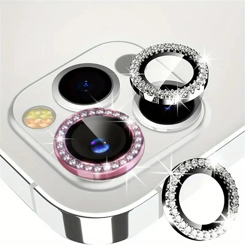 This product is a set of 2-3 pieces of diamond metal camera lens protectors designed for various iPhone models including iPhone 11, 12, 13, 14, 15, 16, and 17 Pro Max, Air, and Mini. It provides excellent protection for your camera lens against scratches and impacts.