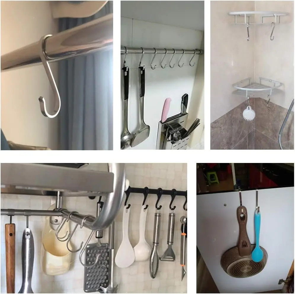 These S-shaped metal hanging hooks are designed for versatile use in various settings such as kitchens, bathrooms, bedrooms, and garages. Made from durable stainless steel, they provide a reliable solution for organizing your space by hanging pots, pans, utensils, and more. Their sturdy construction ensures they can hold a variety of items securely, making them an essential addition to your home.