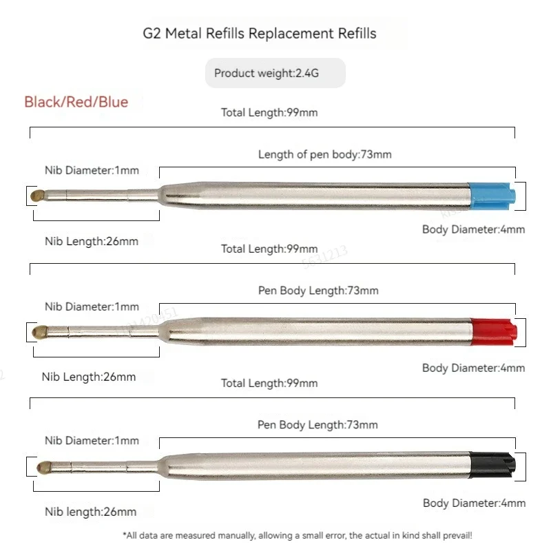 Ballpoint Pen G2 Refills L:3.9 In 99mm Medium Point Blue Red Black Ink