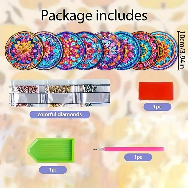 This 8-piece set of DIY diamond painted coasters features intricate mandala patterns and comes with a complimentary cup holder. Perfect for adding a touch of creativity to your home decor while protecting your surfaces.