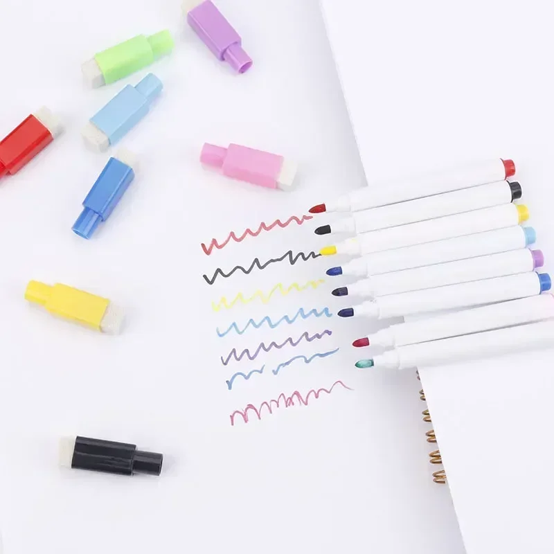 This set includes 8 magnetic whiteboard pens designed for use on whiteboards. Each pen features a built-in eraser, making it easy to correct mistakes and reuse your writing space. Ideal for school supplies, these pens are perfect for children’s graffiti drawing and other creative activities.