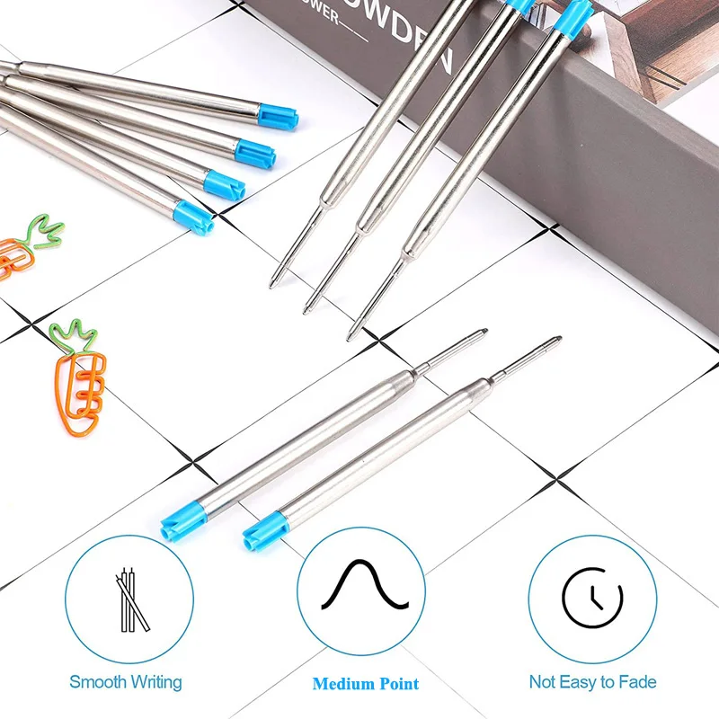 This product includes a set of 9.9cm metal ballpoint pen refills designed for smooth writing. The refills are compatible with various ballpoint pens and come in multiple ink colors to suit your writing needs.