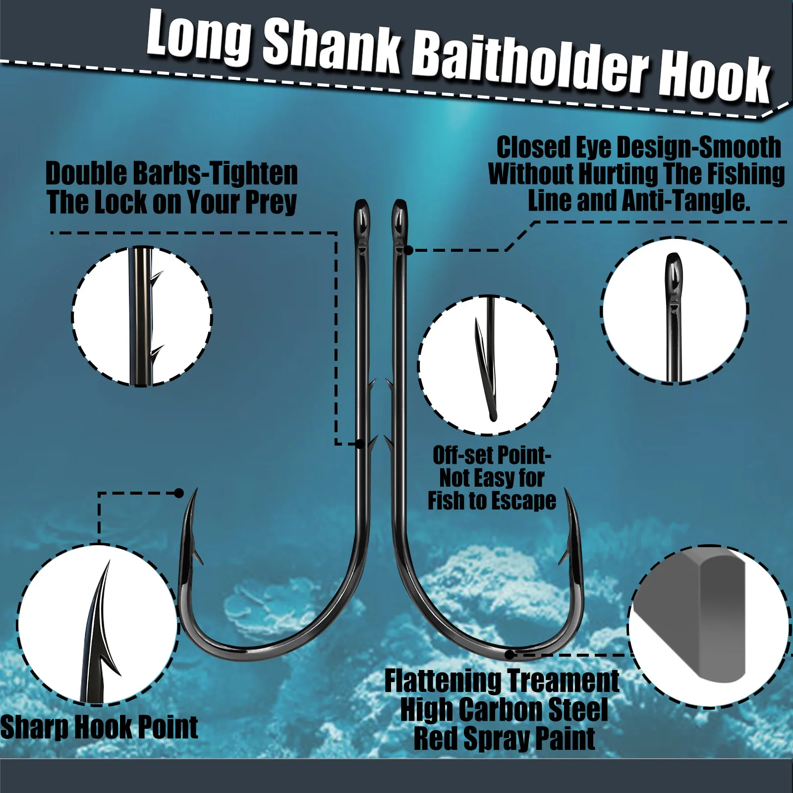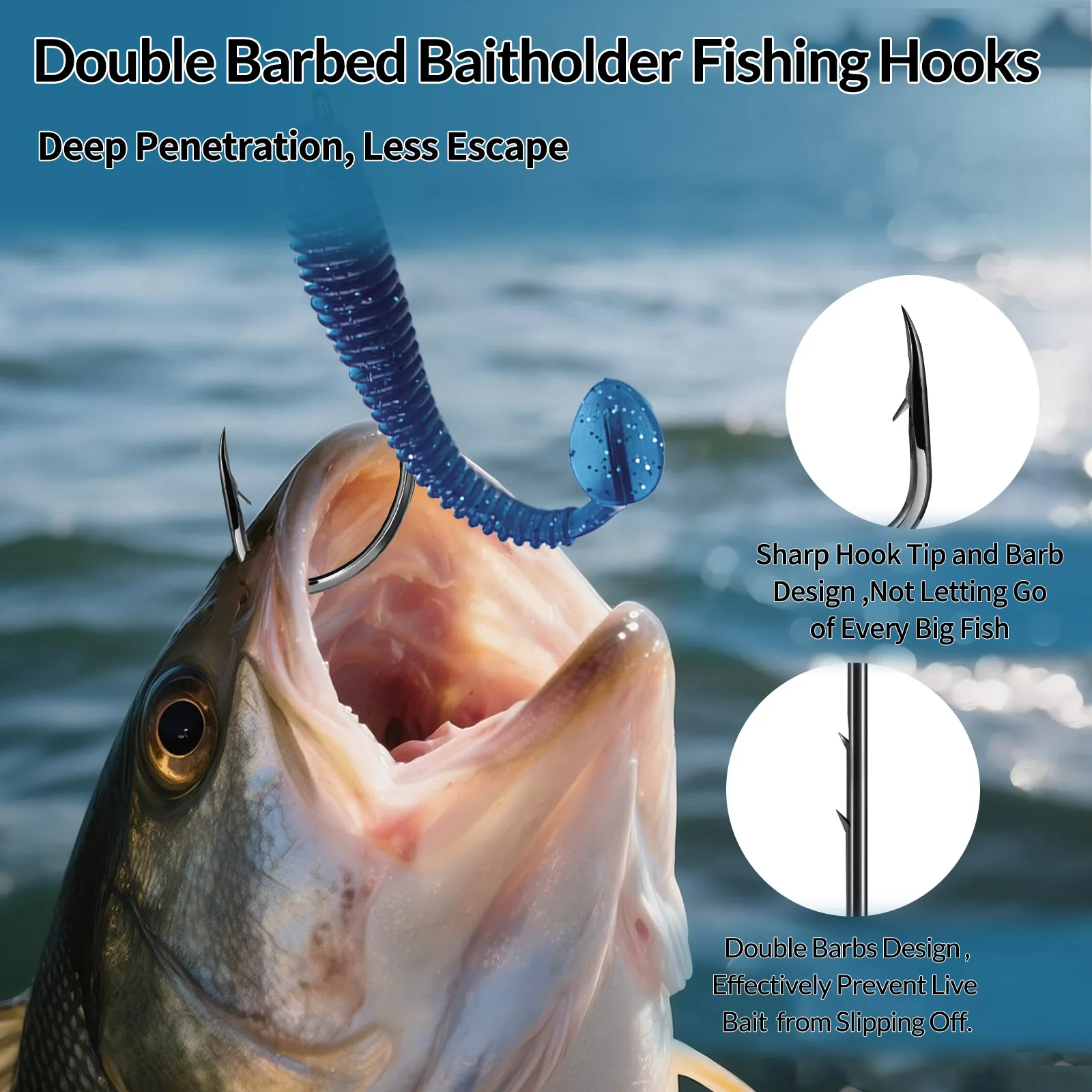 The Baitholder Fishing Hooks are designed for both freshwater and saltwater fishing, providing high strength and durability. These hooks feature a long shank and barbs that securely hold bait, making them ideal for various fishing conditions.