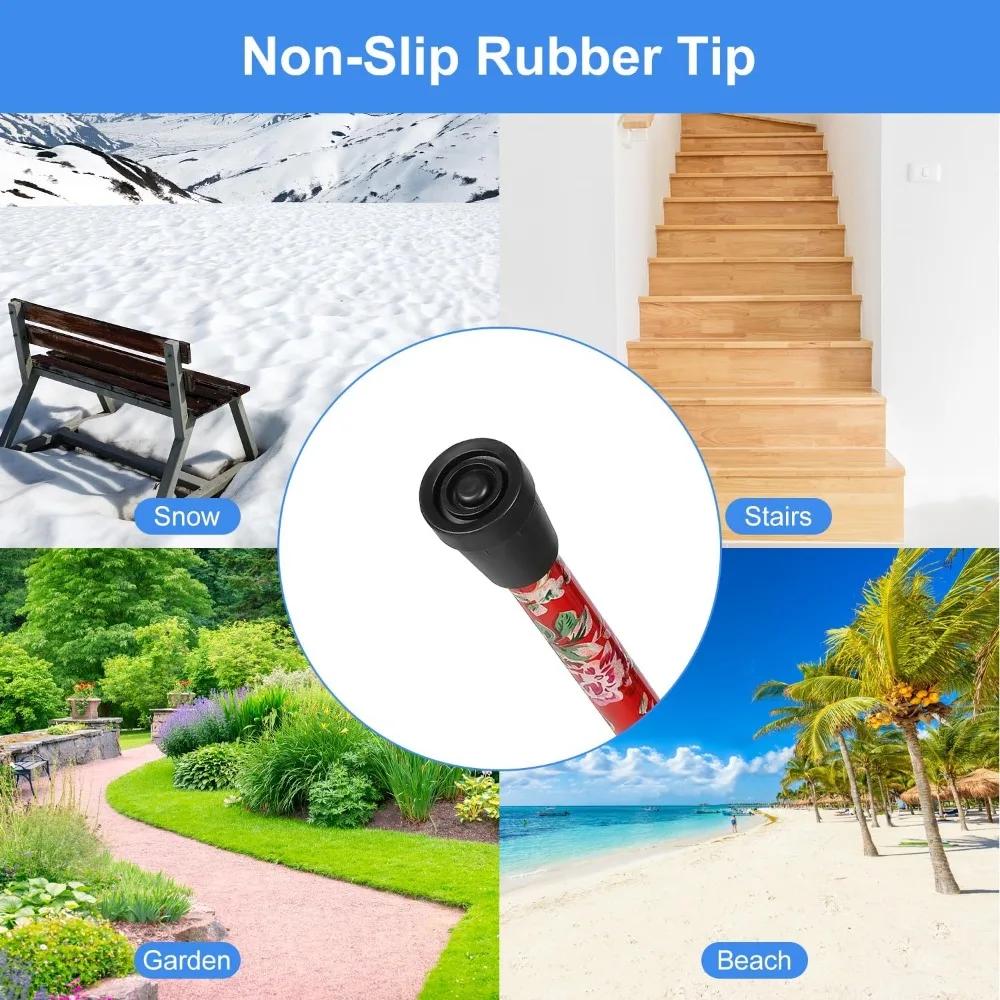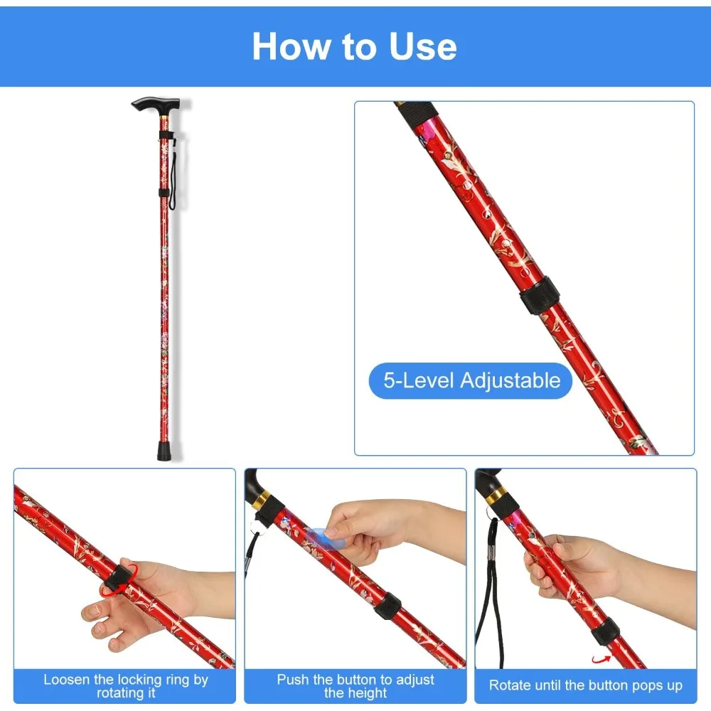 This portable walking stick is designed for the elderly and those needing assistance while walking. It features a flower-shaped design and is made from lightweight aluminum alloy, making it easy to carry and use. The cane can be adjusted to different heights to suit individual preferences, ensuring comfort and safety during use.