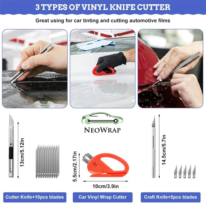 - Utility knife with 10 blades: Great for cutting window films and vinyl sheets to your desired shape.