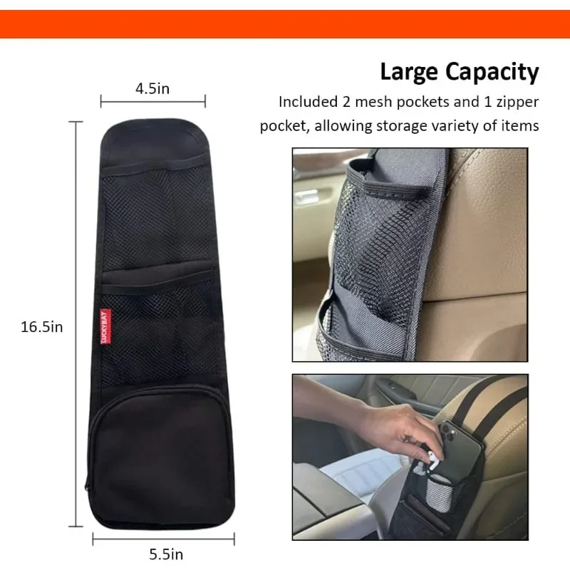 This car seat side organizer is designed to keep your vehicle tidy and your essentials within easy reach. It features multiple pockets for convenient storage of items like phones, snacks, and more.
