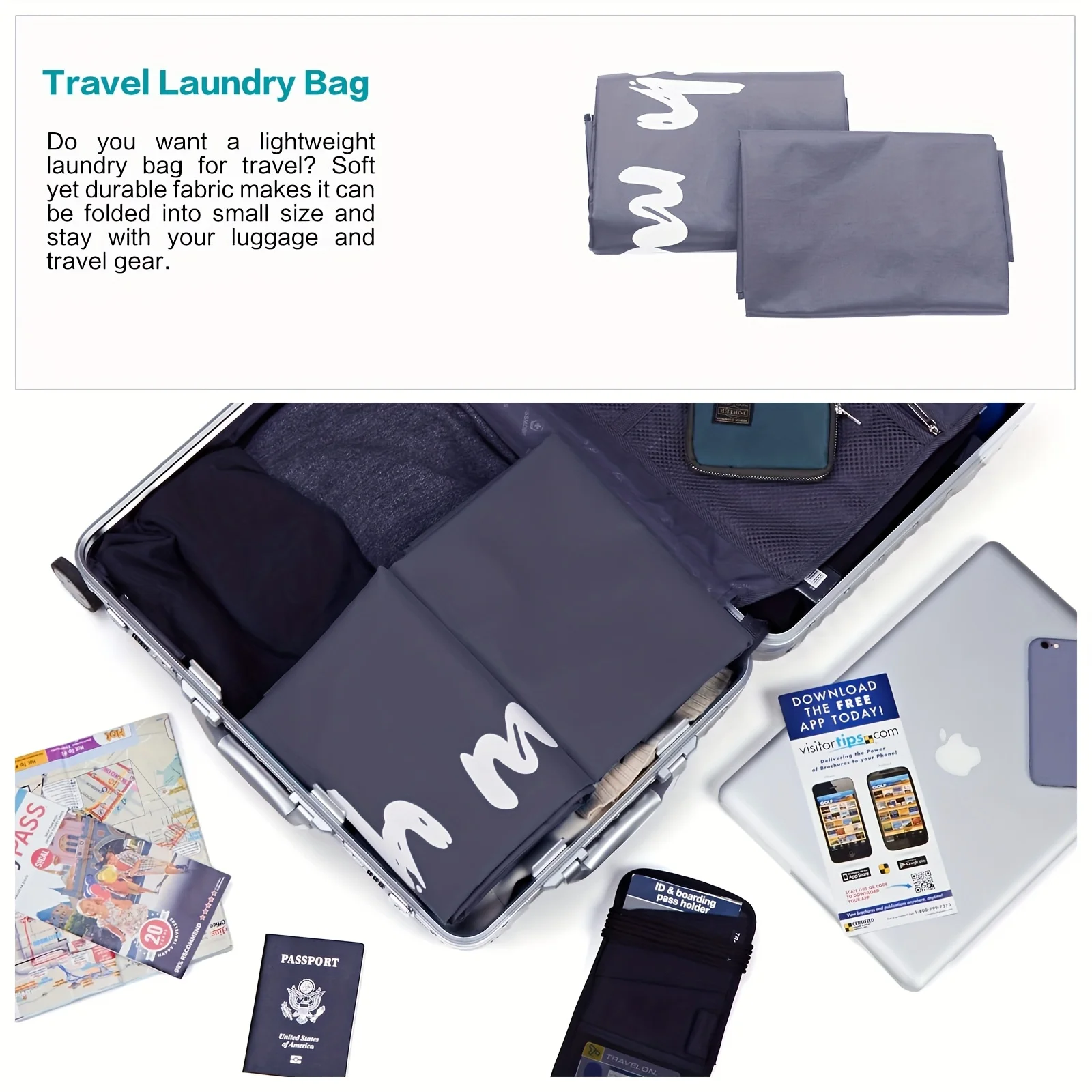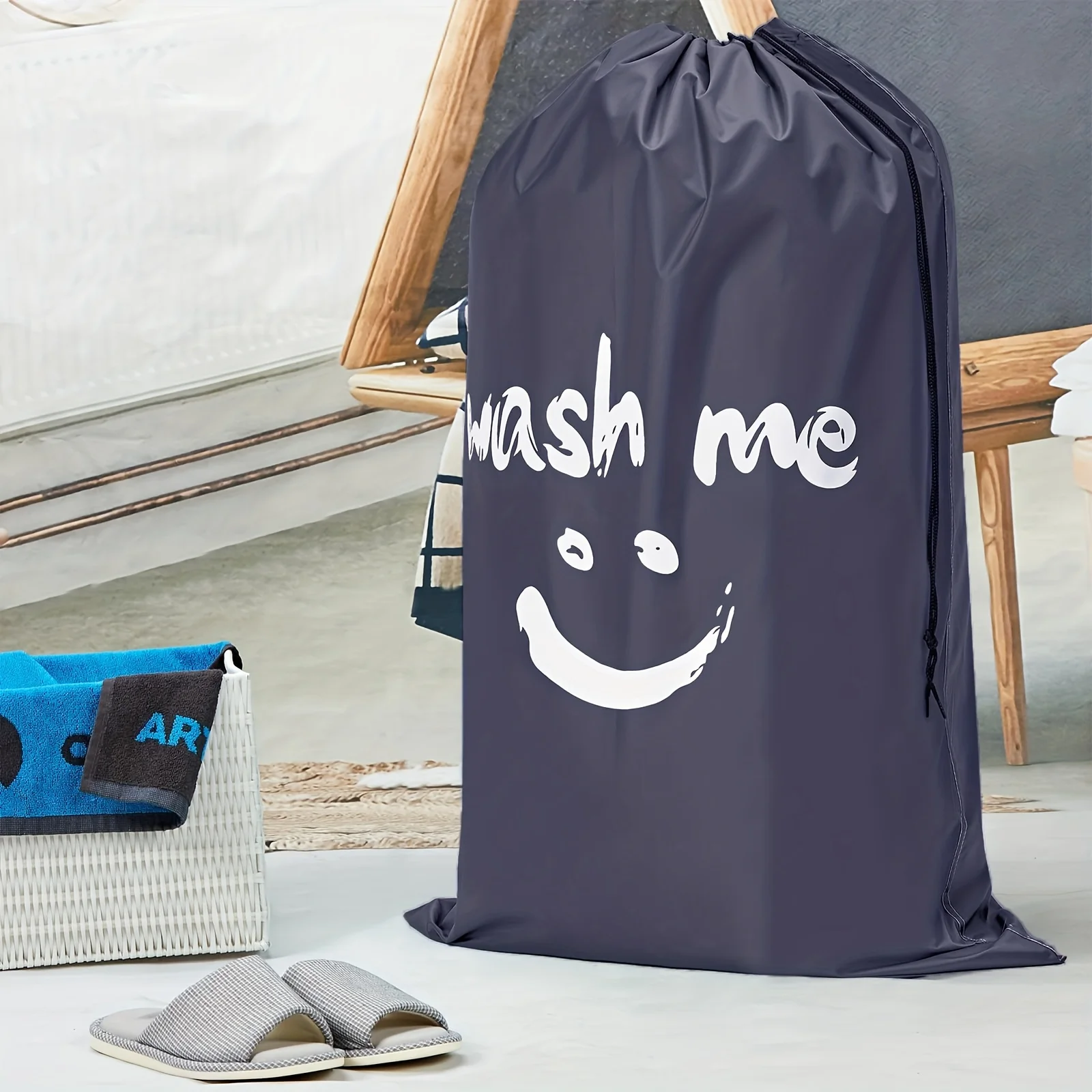 This large laundry bag is designed for travel and home storage, providing a convenient solution for organizing dirty clothes. Made from durable Oxford cloth, it features a drawstring closure for easy access and secure storage.