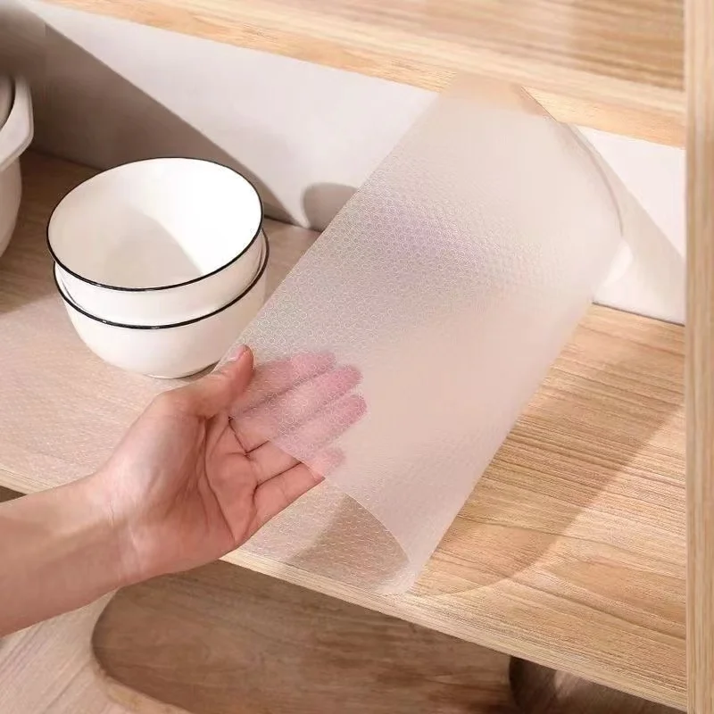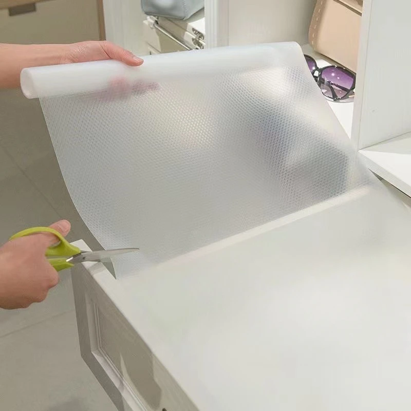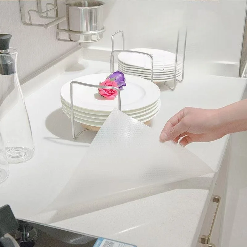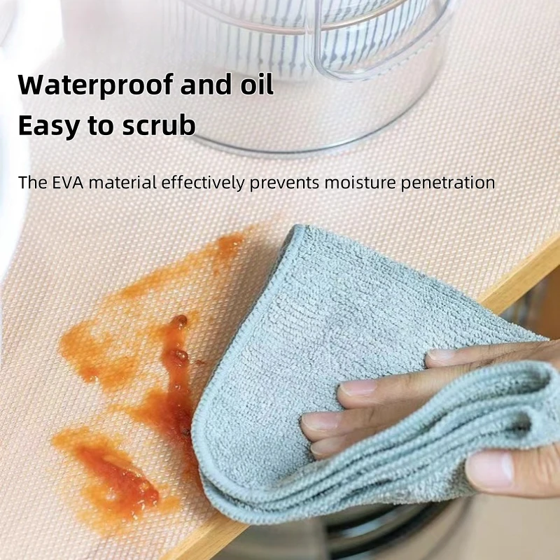 This kitchen cabinet liner is designed to provide a protective layer for your cabinets and drawers. It features a unique water drop pattern that not only enhances the aesthetic appeal but also ensures functionality. The liner is made from durable EVA material, making it easy to clean and maintain, while also being moisture-proof and mildew-proof.